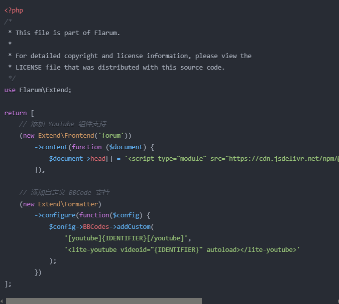 shiyi https://claude.ai/chat/b3ec27da-a34a-443b-93fd-f9f574cd69c1 https://discuss.flarum.org/d/31817-lite-youtube-embed 原帖链接 指令:composer require sycho/flarum-lite-youtube:"*" 这样修改后: 系统会自动加载 YouTube 组件 您可以在帖子中使用以下格式嵌入视频: [youtube]视频ID[/youtube]